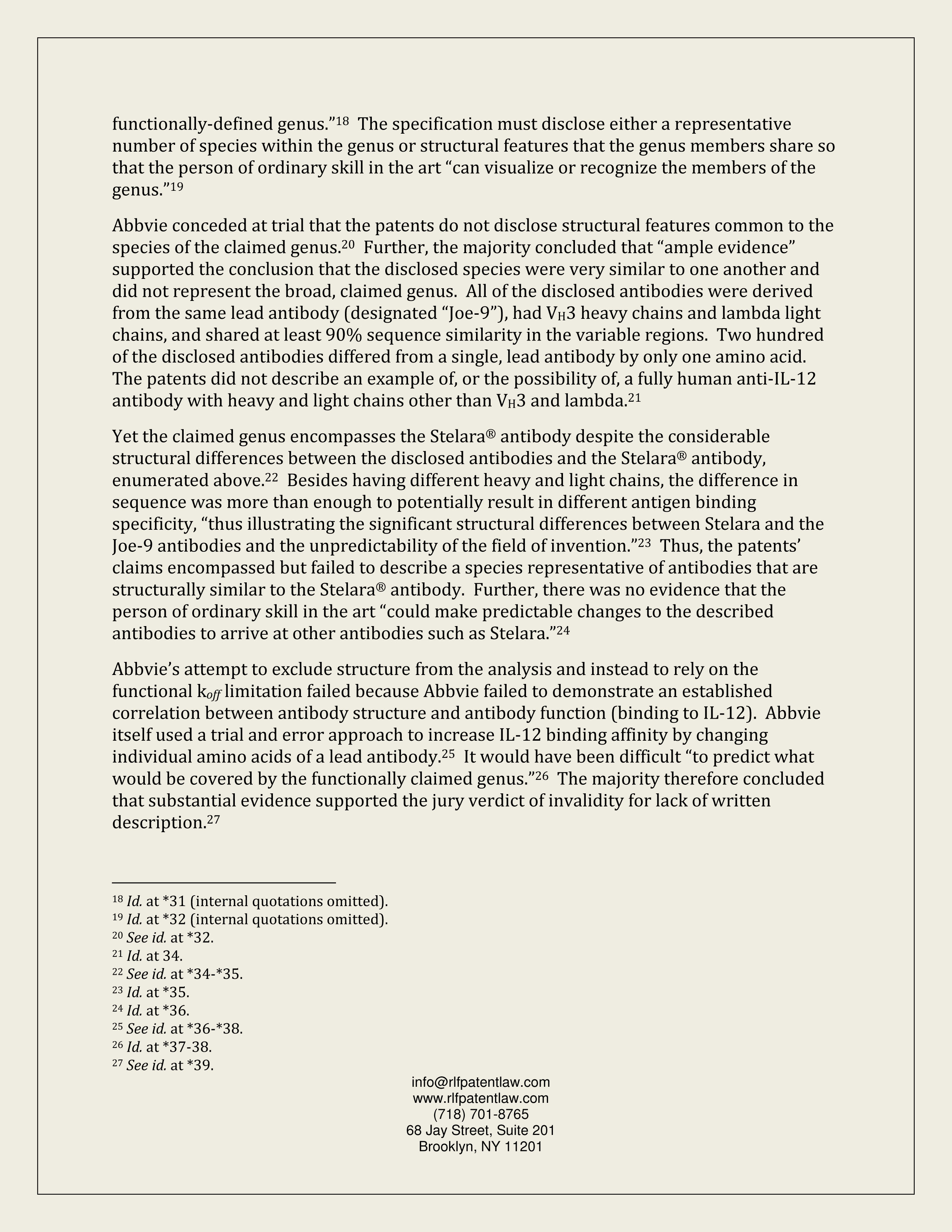 Janssen (biotech/written description/invalidity of claims to antibody genus)